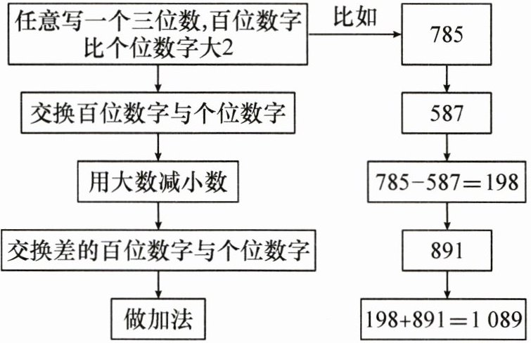 解:举例不唯一,如:614−416=198,198+891=1089.发现:结果一定是1089.设百位数字为a(2<a≤9,且a为整数),十位数字为b,则个位数字为a−2.