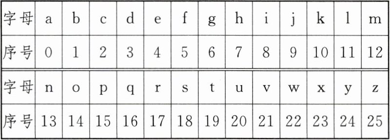 4. (教材P99习题T4变式)有一种密码,将26个英文字母a,b,c,…,z不论大小写依次对应0,1,2,3,…,25这26个自然数(如表格),当明码对应的序号$x$为奇数时,密码对应的序号为$\frac{\vert x - 33\vert}{2}$;当明码对应的序号$x$为偶数时,密码对应的序号为$\frac{x}{2}+5$。按上述规定,将明码“efuz”译成密码是