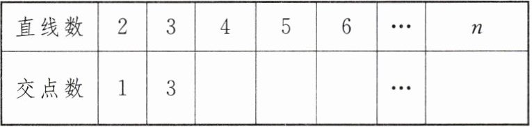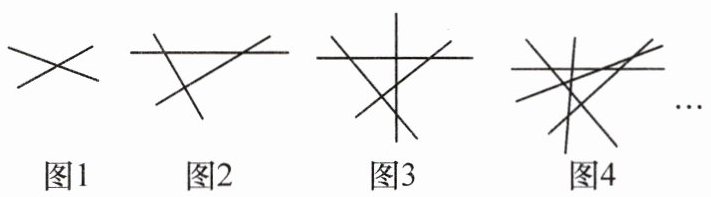 17. 我们知道,两条直线相交,最多有 $ 1 $ 个交点(如图 1);三条直线两两相交,最多有 $ 3 $ 个交点(如图 2);四条直线两两相交,最多有多少个交点(如图 3);五条直线两两相交,最多有多少个交点(如图 4);六条直线两两相交,最多有多少个交点,…,$ n $ 条直线两两相交,最多有多少个交点呢(用含 $ n $ 的代数式表示):
