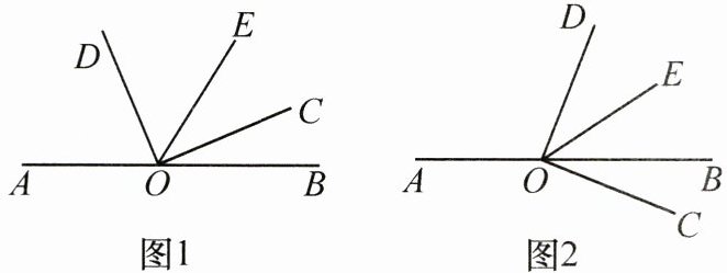 。(用含 $ \alpha $ 的式子表示)(2) 如图 2,当点 $ C $ 与点 $ D $,$ E $ 在直线 $ AB $ 的两侧时,(1) 中②的结论是否仍然成立?请给出结论并说明理由。