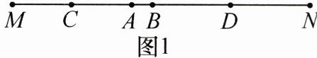 (1) 如图 1,已知线段 $ MN = 45\mathrm{cm} $,$ AB = 3\mathrm{cm} $,点 $ C $ 和点 $ D $ 分别是 $ AM $,$ BN $ 的中点。若 $ AM = 18\mathrm{cm} $,则 $ CD = $
