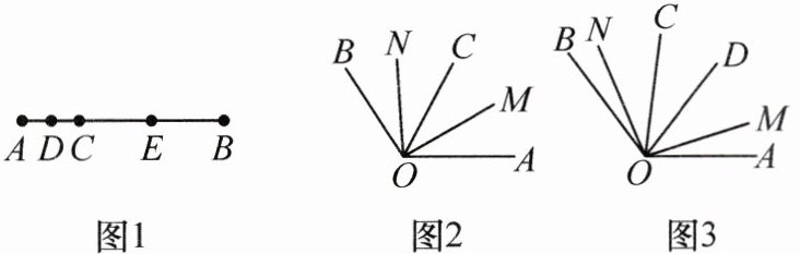 (1) 如图 1,已知线段 $ AB = 14\ cm $,点 $ C $ 为线段 $ AB $ 上的一个动点,点 $ D $,$ E $ 分别是 $ AC $ 和 $ BC $ 的中点。