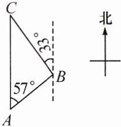 10. (2024·兰州五十四中中期中)如图,小明的奶奶家 $ C $ 在公园 $ A $ 的正北方向处,从公园到奶奶家需要走一条弯路才能到达。小明从公园出发,先沿北偏东 $ 57^{\circ} $ 方向行走到 $ B $ 处,再转弯沿北偏西 $ 33^{\circ} $ 方向走一段才能到达奶奶家,则转弯处 $ \angle ABC $ 的度数为