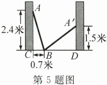 5. 如图,小巷左右两侧是竖直的墙,一架梯子斜靠在左墙时,梯子底端到左墙角的距离 BC 为 0.7 米,梯子顶端到地面的距离 AC 为 2.4 米. 若保持梯子底端位置不动,将梯子斜靠在右墙时,梯子顶端到地面的距离 A'D 为 1.5 米,则小巷的宽为(