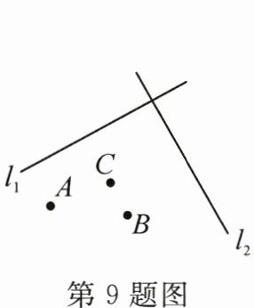 9. 如图,直线l₁⊥l₂,在平面直角坐标系中,l₁//x轴,l₂//y轴,点A,B的坐标分别为(-1,1),(2,-1),则点C在第