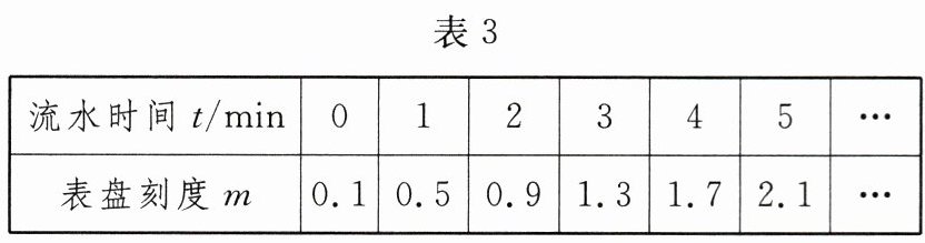 通过对学思小组数据的分析,为让时间“看得见”,善思小组改进了实验装置,如图 2,可以将水的体积直接转化为仪表盘的刻度,小组同学记录了仪表表盘刻度 $ m $ 与流水时间 $ t $ 的数据如表 3.