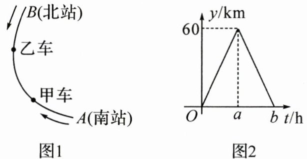8. 如图1,长为60km的某段线路$AB$上有甲、乙两车,分别从南站$A$和北站$B$同时出发相向而行,达到$B$,$A$后立马返回到出发站停止,速度均为30km/h,设甲车、乙车距南站$A$的路程分别为$y_{甲}$,$y_{乙}(km)$,行驶时间为$t(h)(t\geq0)$.
