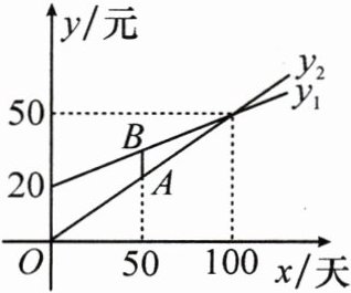 (2)当$x = 50$时,$y_1 = 0.3 × 50 + 20 = 35$,$y_2 = 0.5 × 50 = 25$. $\therefore AB = y_1 - y_2 = 10$.$AB$的实际意义是当借阅50天时,两种方案每本书的借用租金相差10元.