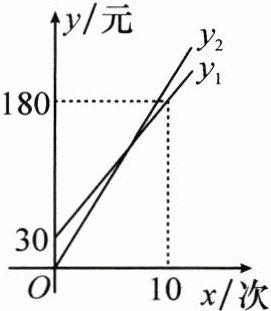 设某学生暑期健身次数为$x$(次),按照方案一所需费用为$y_{1}$(元),且$y_{1}=k_{1}x + b$;按照方案二所需费用为$y_{2}$(元),且$y_{2}=k_{2}x$. 其函数图象如图所示.
