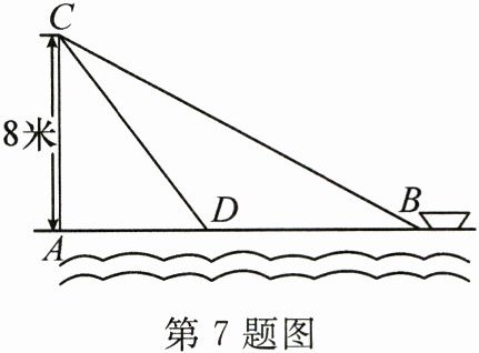 7. 如图,在离水面高度为 8 米的岸上,有人用绳子拉船靠岸,开始时绳子 BC 的长为 17 米,几分钟后船到达点 D 的位置,此时绳子 CD 的长为 10 米,则船向岸边移动了