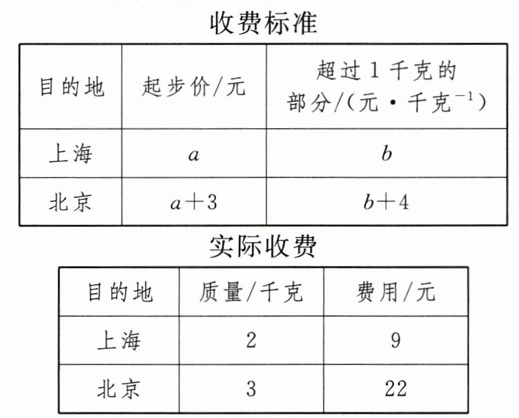 10. 本地某快递公司规定:寄件不超过 1 千克的部分按起步价计费,寄件超过 1 千克的部分按千克计费。小丽分别寄快递到上海和北京,收费标准及实际收费如下表: