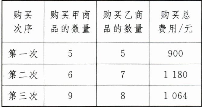 9. (2024·兰州期末)李明在某商场购买甲、乙两种商品若干次(每次甲、乙两种商品都购买),其中前两次按标价购买,第三次购买时,甲、乙两种商品同时打折。三次购买甲、乙两种商品的数量和费用情况如下表所示: