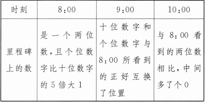$\begin{cases} x = 5y + 1, \10x + y) - (10y + x) = (100y + x) - (10x + y), \end{cases}$解得$\begin{cases} x = 6, \\y = 1. \end{cases}\therefore 8:00$看到的两位数是16,9:00看到的两位数是$61. \therefore$卡车的速度为(61 - 16) ÷ 1 = 45(km/h).答:卡车的速度为45 km/h.
