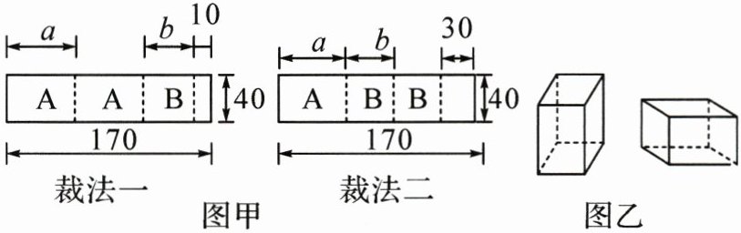 6. 新考向 综合与实践 我市某包装生产企业承接了一批上海世博会的礼品盒制作业务,为了确保质量,该企业进行试生产. 他们购得规格是 $170\ cm×40\ cm$ 的标准板材作为原材料,每张标准板材再按照裁法一或裁法二裁下 A 型与 B 型两种板材(如图甲,单位:cm).
