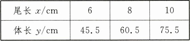 5. (2024·山西)生物学研究表明,某种蛇在一定生长阶段,其体长$y(cm)$是尾长$x(cm)$的一次函数,部分数据如下表所示,则$y$与$x$之间的关系式为(