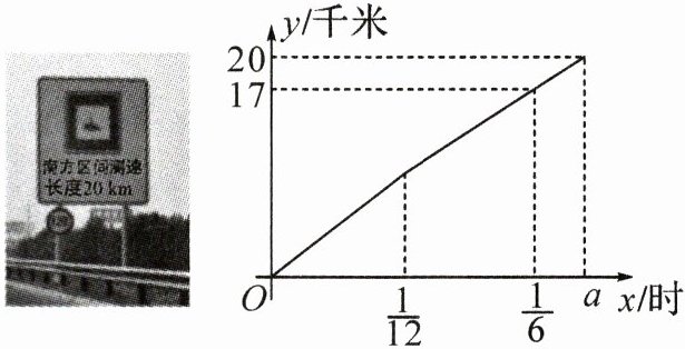 5. 新考向 真实情境(2024·长春)区间测速是指在某一路段前后设置两个监控点,根据车辆通过两个监控点的时间来计算车辆在该路段上的平均行驶速度。小春驾驶一辆小型汽车在高速公路上行驶,其间经过一段长度为 20 千米的区间测速路段。从该路段起点开始,他先匀速行驶 $ \dfrac{1}{12} $ 小时,再立即减速以另一速度匀速行驶(减速时间忽略不计)。当他到达该路段终点时,测速装置测得该辆汽车在整个路段行驶的平均速度为 100 千米/时。汽车在区间测速路段行驶的路程 $ y $(千米)与在此路段行驶的时间 $ x $(时)之间的函数图象如图所示。