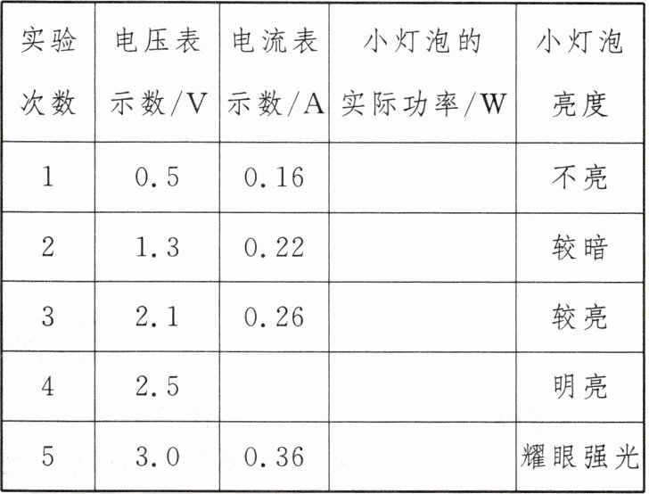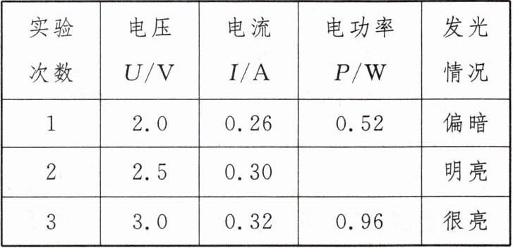 (6) 再次调节滑动变阻器,使小灯泡两端的电压约为额定电压的0.8倍和1.2倍,并将有关实验数据和现象记录在表中。