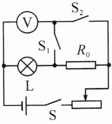 3. 在没有电流表的情况下,小明用如图所示的实验电路测出小灯泡的额定功率。已知小灯泡的额定电压为Uₙ,定值电阻的阻值为R₀,实验步骤如下: