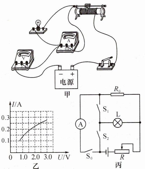 (填“R₁”或“R₂”)。(4) 另一小组为了测量已知额定电压为Uₙ的小灯泡的额定功率,设计了图丙所示的电路(R₀为阻值已知的定值电阻,R为滑动变阻器)。