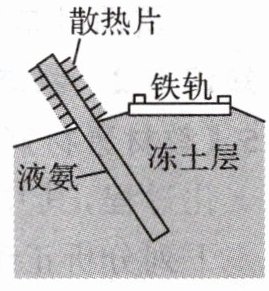 9. (2024·潍坊)为保证青藏铁路多年冻土区路基的稳定性,铁路两侧安装了许多封闭的中空热棒。如图所示,热棒下端插在冻土中,内部填充低沸点的液态氨,利用氨的物态变化给冻土降温,把冻土中的热量“搬运到”热棒上端,通过散热片向空中放热,从而使冻土保持稳定。下列说法正确的是(