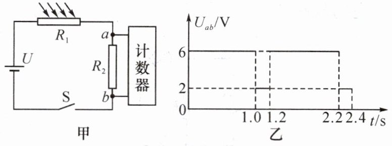 12. (2023·海南)如图甲为某商场安装的扶梯自动计数器简化电路图。已知电源电压$U = 12V$,$R_{1}$为光敏电阻,$R_{2}=20Ω$。当有光照射时$R_{1}=20Ω$;当扶梯上有顾客经过,挡住射向$R_{1}$的光线时,$R_{1}$的阻值增大,计数器就计数一次。图乙为某段时间内$R_{2}$两端的电压$U_{ab}$随时间$t$变化的图像。