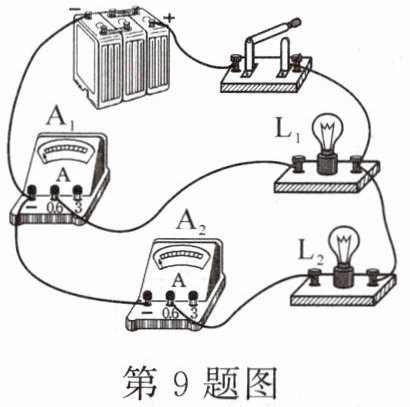 9. 某实验小组连接了如图所示的电路,其中电流表$A_{2}$测量通过小灯泡