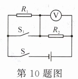 关$S$闭合,$S_{1}$由闭合到断开时,电压表的示数由$12V$变为$8V$,定值电阻$R_{1}$与$R_{2}$的阻值之比为1:2