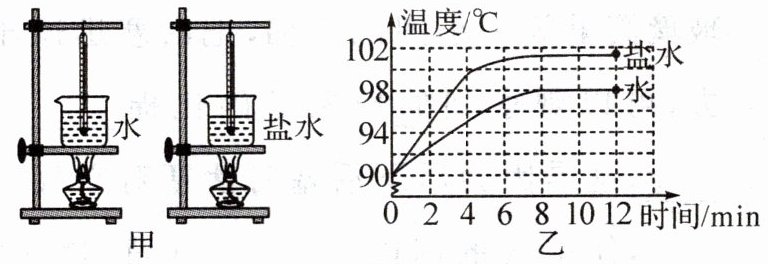 13. (2024·福建)探究液体在沸腾前后温度变化的特点,实验装置如图甲。取质量相等的水和盐水分别放入两个相同的烧杯中,用相同的酒精灯同时加热,根据实验数据,绘制温度随时间变化的图像,如图乙。