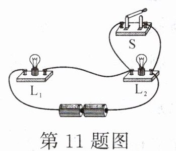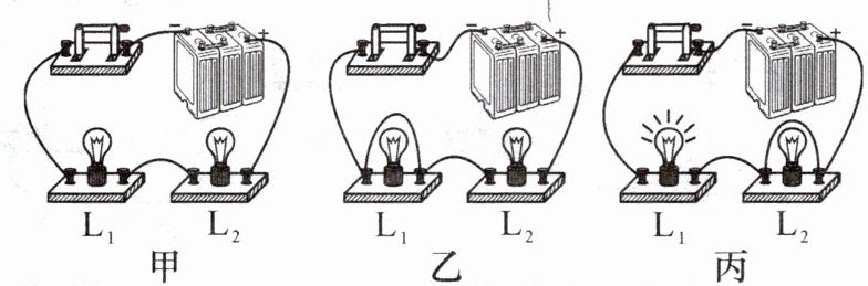 15. 如图甲所示电路,闭合开关后,L₁和L₂都不亮,现用一根导线检查故障原因。如图乙所示,将导线接在L₁两端时,L₁和L₂仍然不亮;如图丙所示,将导线接在L₂两端时,L₁亮,L₂不亮。根据上述现象,电路故障应该出现在