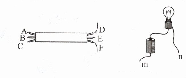 ,说明两个线头为同一根导线的两端。(3)若确定A、D线头为同一根导线的两端,连接A、B线头,将导线m连接在D线头上,当导线n连接F线头时小灯泡发光,由此可以确定C线头和