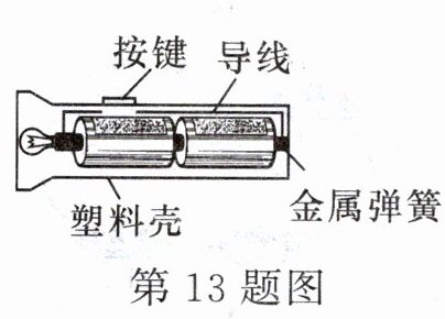 13. 如图所示是手电筒的构造示意图,电源为两节新干电池,其中干电池工作时将化学能转化为