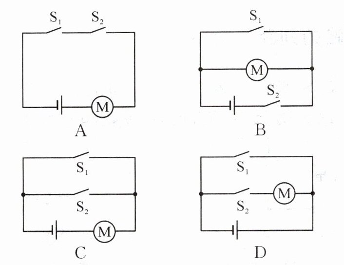 8. (2024·菏泽)为确保安全,某品牌电动车须拧动钥匙(相当于闭合开关$S_{1}$)且按下按键(相当于闭合开关$S_{2}$)才能启动。下列电路设计符合要求的是 (