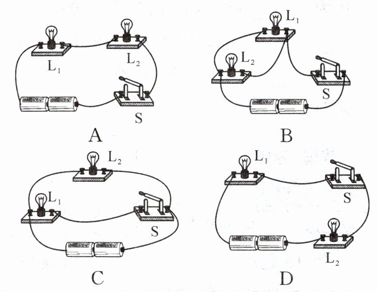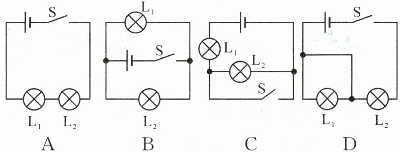 2. 如图所示的电路中,当开关$S$闭合时,灯泡$L_{1}$、$L_{2}$并联的是 (