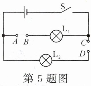 5. 如图所示,$ L_1 $、$ L_2 $是两个相同的小灯泡,A、B、C、D 是四个接线柱,若用导线将 A、B 和 C、D 分别连接起来,则 $ L_1 $、$ L_2 $是