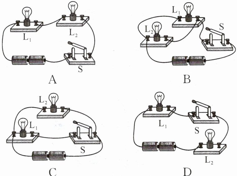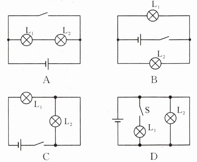 1. 在如图所示的四个电路中,开关能够同时控制两盏灯,且两灯并联的是(
