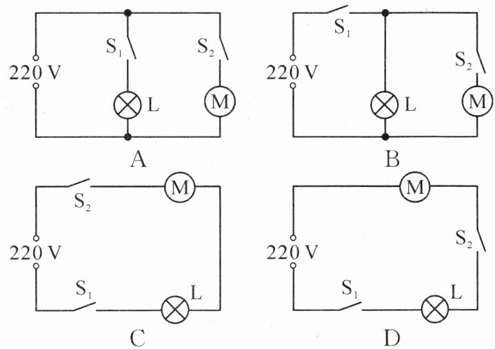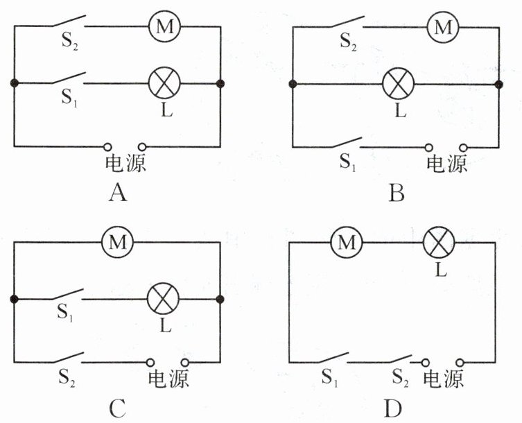 1. (2024·无锡)电冰箱冷藏室中的照明灯 L 由门控开关 $ S_1 $ 控制,压缩机(电动机)由温控开关 $ S_2 $ 控制,要求照明灯和压缩机既能单独工作又能同时工作,下列电路中符合上述要求的是 (