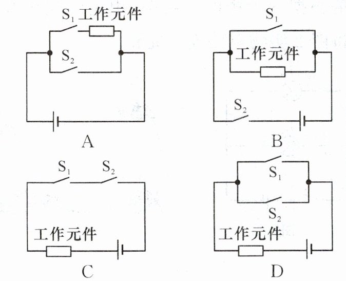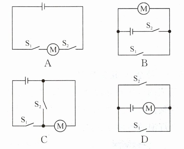 4. (2024·泰安)小文同学家安装了密码门锁,能通过输入密码($ S_1 $)或利用钥匙($ S_2 $)单独驱动电动机工作而打开门锁。下列电路设计符合要求的是 (