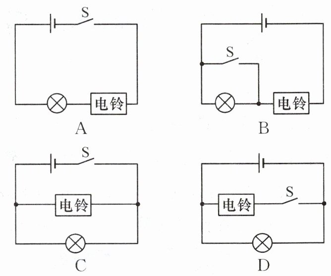 2. (2024·天津)某兴趣小组要为居家老人设计一个“应急呼叫器”电路,要求:开关断开时,电灯和电铃均不工作;开关闭合时,灯亮铃响,即使电灯因开路不亮,电铃仍可工作。如图所示的电路中,符合设计要求的是 (