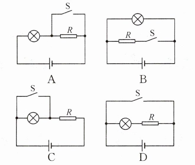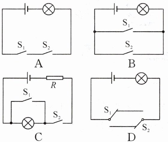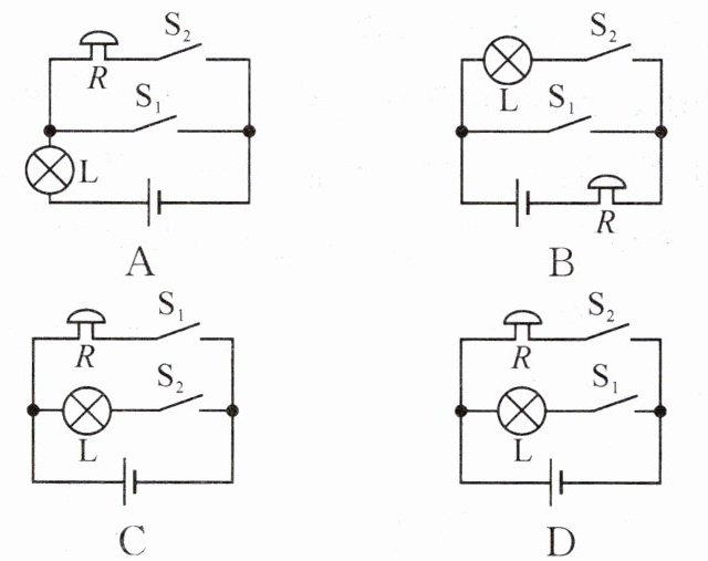 10. 宾馆房间有门铃系统,当房客闭合开关 $ S_1 $,“请勿打扰”灯泡 L 发光,来访者即便闭合门铃开关 $ S_2 $,门铃 R 也不发声;只有在 $ S_1 $ 断开、 $ S_2 $ 闭合时,门铃才发出“叮咚”声。下列电路设计中,跟该门铃系统功能吻合的是 (