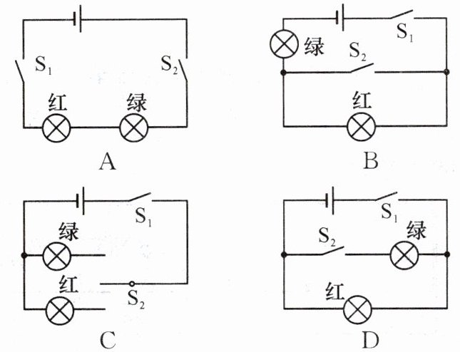 6. 下列电路中,符合交通信号灯(只考虑红灯和绿灯)模拟设计的是 (