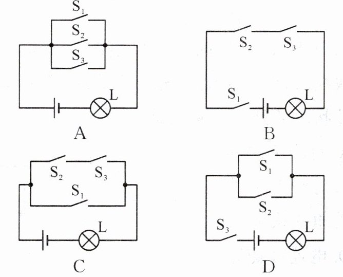 8. (2024·枣庄)常用智能手机是通过指纹开关 $ S_1 $ 或密码开关 $ S_2 $ 来解锁的,若其中任何一种方式解锁失败后,锁定开关 $ S_3 $ 均会断开而暂停手机解锁功能,开关 $ S_3 $ 将在一段时间后自动闭合而恢复解锁功能。若用灯泡 L 发光模拟手机解锁成功,则图中符合要求的模拟电路是 (