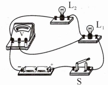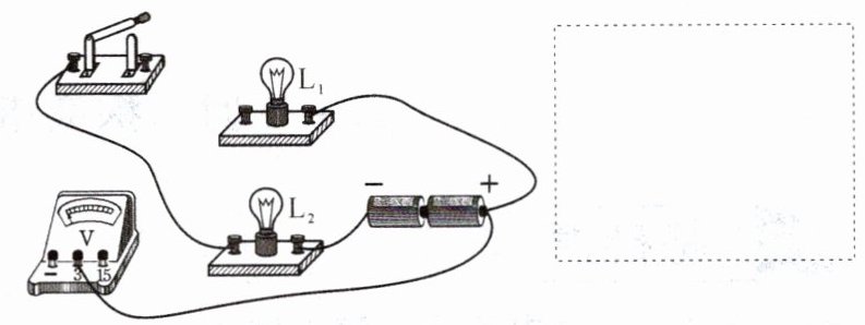 12. 在如图所示的实物电路中,有两根导线尚未连接,用笔画线代替导线将电路连接完整,并在虚线框内画出对应的电路图。要求:两灯串联,电压表测量灯 L₁两端的电压,导线不能交叉。