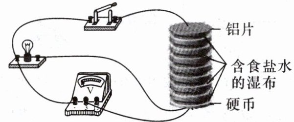 13. 小明将铝片和硬币依次堆叠,用浸有食盐水的湿布置于铝片和硬币之间自制“伏打电堆”并连接了如图所示电路。闭合开关后,小灯泡发光,电压表指针右偏,则下列说法中正确的是 (