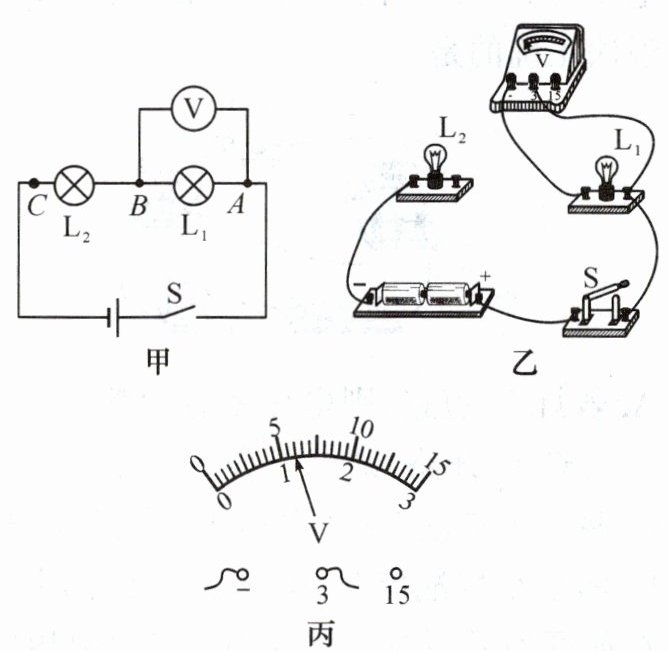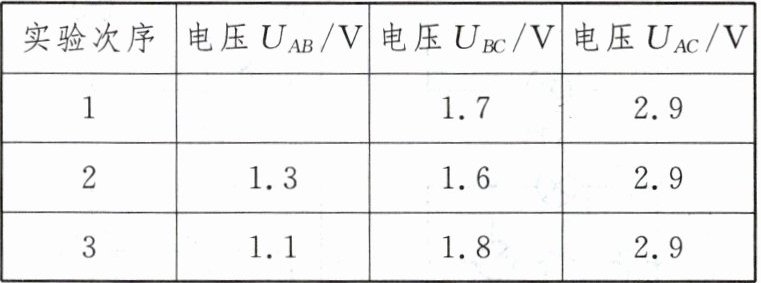 (3)用电压表分别测出电压$U_{AB}$、$U_{BC}$和$U_{AC}$。其中测$U_{AB}$时,电压表的示数如图丙所示,为