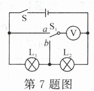 7. (多选)如图所示的电路中,闭合开关$S$,当开关$S_{1}$接到$a$时,电压表示数为$6V$;当开关$S_{1}$接到$b$时,电压表示数为$2V$。下列说法中错误的是(