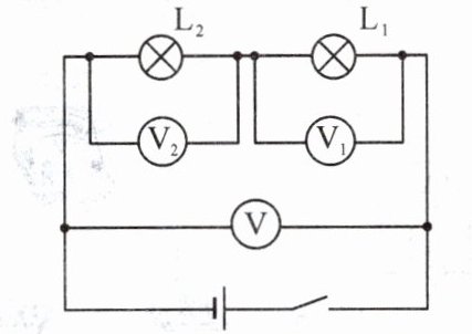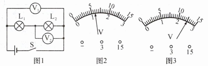 V。【变式】若开关闭合后,$V_{1}$和$V_{2}$的示数分别如图2和图3所示。则小灯泡$L_{1}$两端的电压是