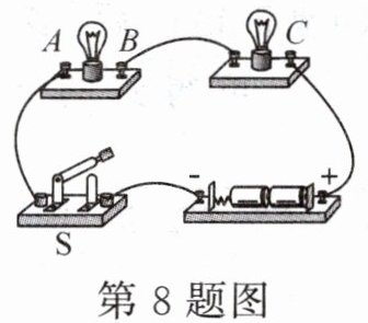 8. (2024·济南二模)如图是“探究串联电路的电流特点”的电路。闭合开关$S$,用电流表分别测出$A$、$B$、$C$点的电流,记录数据后,为得到更普遍的结论,接下来应(