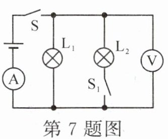 7. 如图所示电路中,电源电压为 $ 3 \, V $ 且不变,只闭合开关 $ S $ 时,电流表示数为 $ 0.3 \, A $;当同时闭合开关 $ S $、$ S_1 $ 时,电流表的示数将