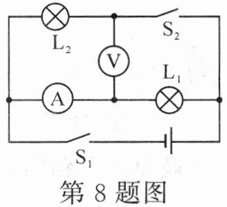 8. 如图所示的电路中,电源电压为 $ 5 \, V $。开关 $ S_1 $ 闭合、$ S_2 $ 断开时,电压表的示数是