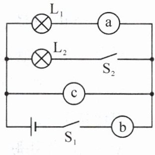6. 在如图所示的电路中,$ a $、$ b $、$ c $ 分别代表的是电压表或电流表。当开关 $ S_1 $、$ S_2 $ 都闭合时,灯泡均正常发光,各个仪表均正常工作。下列说法中正确的是 (